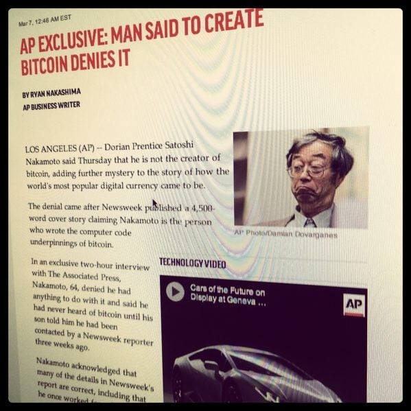En un temps record, une foule journalistes s’est amassée devant la maison du présumé créateur de Bitcoin, dans la banlieue de Los Angeles. Ce dernier a fini par accepter d’accorder une interview à un seul d’entre eux – Ryan Nakashima, américano-japonais comme lui, de l’Associated Press – en l’échange d’un plateau de sushis. Après une course-poursuite rocambolesque entre son véhicule et des journalistes éconduits, Dorian Nakamoto accorda une interview de deux heures à l’AP, démentant formellement être à l’origine de la monnaie virtuelle et affirmant qu’il ignorait encore tout de Bitcoin trois semaines plus tôt. (1) Selon l’ex-ingénieur, dont la maîtrise de l’anglais ne semble pas exempte de lacunes – contrairement à Satoshi Nakamoto -, les citations qui lui sont attribuées dans l’article ont été déformées et sorties de leur contexte. Ses déclarations concerneraient ses travaux d’ingénieur, et non la genèse de Bitcoin. Goodman, de son côté, maintient que les propos de Dorian Nakamoto n’avaient rien d’ambigu.