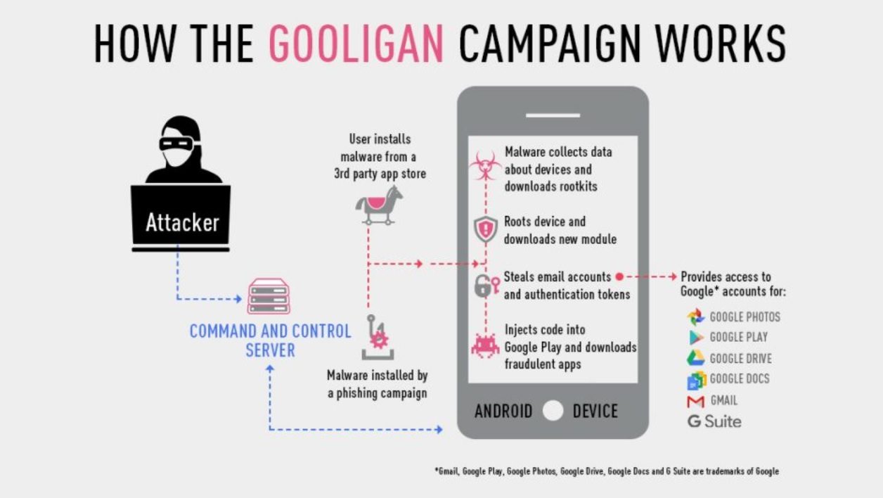Une fois le smartphone ou la tablette infecté, le pirate installe à distance des outils pour intercepter les jetons d’authentification du compte Google. Ce qui lui permettrait, en théorie, d’accéder à Gmail, Google Photos, Google Drive, Google Docs, etc. Mais les données des utilisateurs ne semblent pas vraiment intéresser les pirates. L’accès au compte Google leur sert à télécharger des applications depuis le Google Play Store et donner des notes. Pour tromper la boutique de Google, le malware est capable d’imiter de façon logicielle le comportement d’un vrai utilisateur. Un technique que l’on avait déjà vu en juillet dernier, avec le malware HummingBad. Parallèlement, les pirates de Gooligan installent sur le terminal des logiciels pour afficher des publicités.