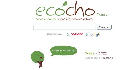 commun. ‘Ecocho propose aussi une barre d’outils à installer dans les navigateurs Firefox et Internet Explorer 6 et 7. Il peut aussi être ajouté à la liste des moteurs proposés par ces navigateurs dans la fenêtre de recherche rapide.Les déclinaisons européennes du site, victimes d’une trop grande affluence, renvoient pour le moment vers la version en .com. Signe d’une prise de conscience ?