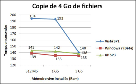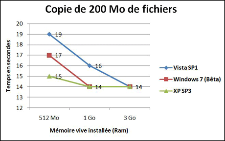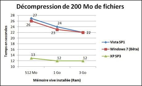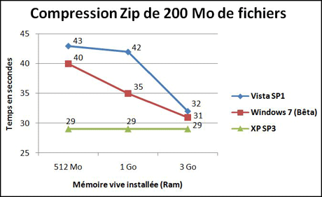 tests (Voir notre protocole ci-dessous) sur chaque système avec 512 Mo, 1 Go et 3 Go de mémoire vive.Pour la copie, Windows XP et Windows 7 font jeu égal, Windows 7 se classant premier pour la copie de gros fichiers. Pour la compression et la décompression, XP devance aussi bien Vista que Windows 7. A noter pour Vista et,