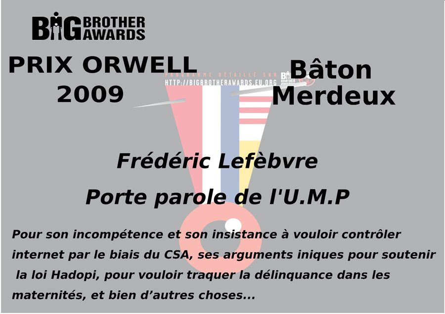 Frédéric Lefebvre, porte-parole de l’UMP, n’obtient pas de prix mais une mention spéciale pour « son incompétence et son insistance à vouloir contrôler Internet par le biais du CSA, ses arguments iniques pour soutenir la loi Hadopi, pour vouloir traquer la délinquance dans les maternités et bien d’autres choses… ». Et les Big Brothers Awards de conclure : « Au secrétariat d’Etat au numérique, il aurait fait un malheur ! »