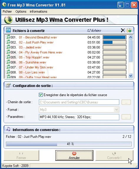 Votre baladeur ne lit pas le format WMA ? Vos fichiers Wav ou Flac prennent trop de place sur votre disque dur ? Vous ne parvenez pas à convertir des fichiers AAC en MP3 ? Pour en finir une fois pour toutes avec les incompatibilités, utilisez Free MP3 WMA Converter. Il décode et encode dans presque tous les formats existants, rapidement et en respectant la qualité sonore. De plus, l’utilisation de ce logiciel est d’une simplicité enfantine. Faites simplement attention, lors de l’installation, à cocher les bonnes cases, pour ne mettre que le strict nécessaire.