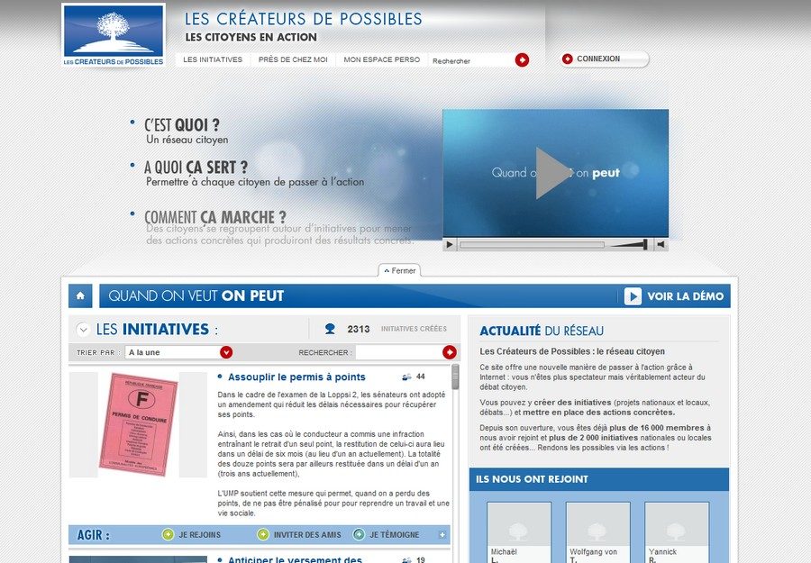 Le site devrait être purement et simplement fermé dès la deuxième quinzaine de janvier. Il aura donc vécu à peine un an, puisqu’il avait été inauguré en janvier 2010, en toute discrétion déjà. Le projet avait été présenté lors du campus d’été du parti de droite en septembre 2009. Visiblement, les jeunes UMP n’ont pas été séduits par ce « réseau d’actions citoyen », qui était censé être ouvert à tout internaute soucieux de « créer des initiatives (projets nationaux et locaux, débats…) et de mettre en place des actions concrètes ».