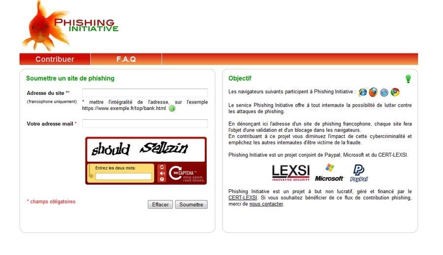 Et un nouveau site pour lutter contre le phishing, un ! Microsoft, Paypal et le Cert-Lexsi viennent de lever le voile sur phishing-initiative.com, un site Web qui permet aux internautes francophones de participer à la lutte contre le hameçonnage… en soumettant eux-mêmes les sites de phishing sur lesquels ils sont tombés. Les sites indiqués par les internautes sont vérifiés manuellement et en quelques minutes par les équipes du Cert-Lexsi afin de mettre à jour immédiatement une base de données de pages Web à risques.