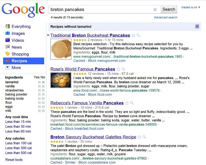 Mais où s’arrêtera donc Google ? Depuis hier, 24 février, le moteur (dans sa version américaine seulement) propose une nouvelle option à ses visiteurs : la recherche de recettes de cuisine. La fonction est disponible dans la colonne de gauche. Elle permet non seulement de filtrer les résultats pour n’afficher que les recettes, mais offre aussi quelques options supplémentaires : il est possible d’affiner la recherche en sélectionnant les ingrédients à utiliser ou à bannir, le temps nécessaire et la quantité de calories du plat.