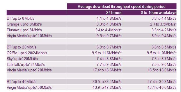 Sur les offres ADSL promettant une vitesse de connexion jusqu’à 8 Mbit/s, les mesures montrent qu’en réalité les abonnés n’ont, en moyenne, pas plus de 4,1 à 4,8 Mbit/s. Et encore, ceux qui sont chez l’opérateur BT. Ceux qui sont clients de Plusnet n’ont eux droit qu’à 3,4 à 4,4 Mbit/s. En soirée, c’est pire puisque en raison d’une forte affluence, les débits chutent. Entre 20 et 22 heures, les clients d’Orange UK peuvent au mieux espérer du 3,5 Mbit/s.