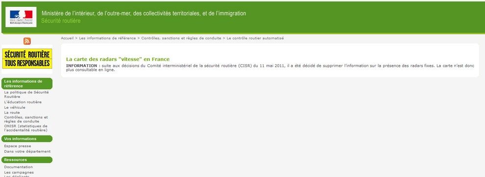 C’est ce qu’on appelle ne pas traîner. Dans la foulée des décisions prises par le comité interministériel sur la sécurité routière qui s’est tenu hier, 11 mai 2011 – parmi lesquelles l’interdiction annoncée des avertisseurs de radars –, la Sécurité routière a retiré de son site la carte qui répertoriait les appareils fixes. Elle écrit : « Il a été décidé de supprimer l’information sur la présence des radars fixes. La carte n’est donc plus consultable en ligne. »