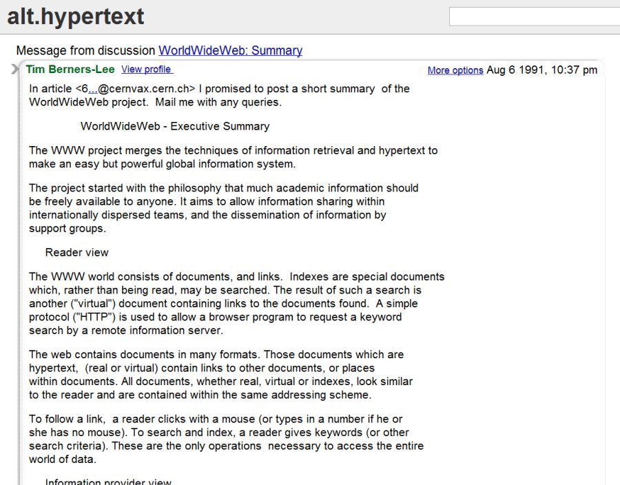 Déjà vingt ans… Ce n’est qu’un petit message sur Usenet, posté sans tambour ni trompette sur le groupe de discussion alt.hypertext en ce 6 juillet 1991.