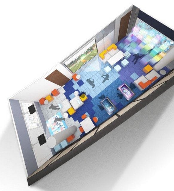 De quoi s’agit-il ? C’est une salle aménagée par l’éditeur, où sont mis à disposition des enseignants tout un ensemble d’outils technologiques de dernière génération. Ici, les élèves peuvent manipuler des tables tactiles, marcher sur un sol interactif, écrire sur un tableau virtuel, regarder des projections en 3D, etc. Le tout est agencé dans un espace au design sophistiqué, conçu par le cabinet d’architecture Fielding & Nair.