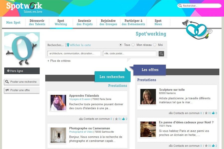 Egalement fondé par un Français, Karim Toumi, Spotwork est un réseau social qui réunit des personnes passionnées et désireuses de partager leur savoir-faire, leur talent… Cet espace de « co-working » fonctionne sur le partage d’informations qualifiées et les recommandations d’amis. Nous possédons tous un talent ou des compétences qui peuvent être précieuses pour d’autres : décoration, finance, cuisine…