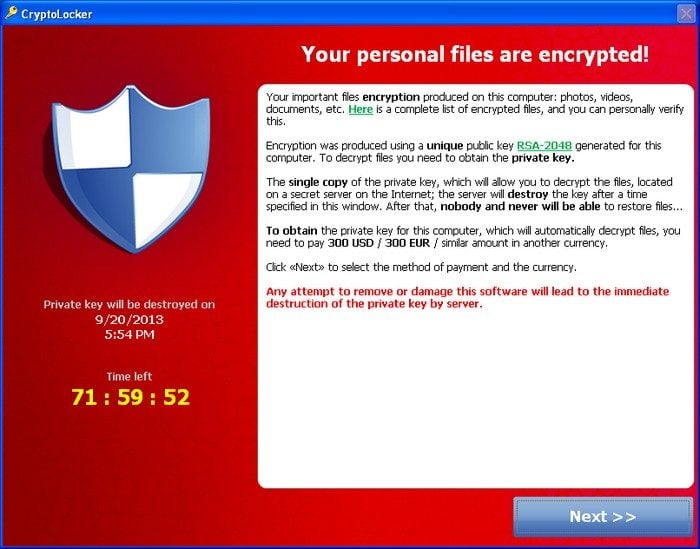 Au second trimestre 2013, McAfee avait identifié 320 000 nouveaux échantillons de ce type de malware, un « chiffre record ». La seconde moitié de l’année fut marquée par l’apparition, début septembre, de CryptoLocker, un cheval de Troie qui se diffuse via des mails infectés, principalement dans les pays anglophones. Il est déguisé en factures UPS/FedEx ou en messages bancaires. Une fois installé, il chiffre les données personnelles par une clé RSA 2048 bits, stockée sur des serveurs pirates.