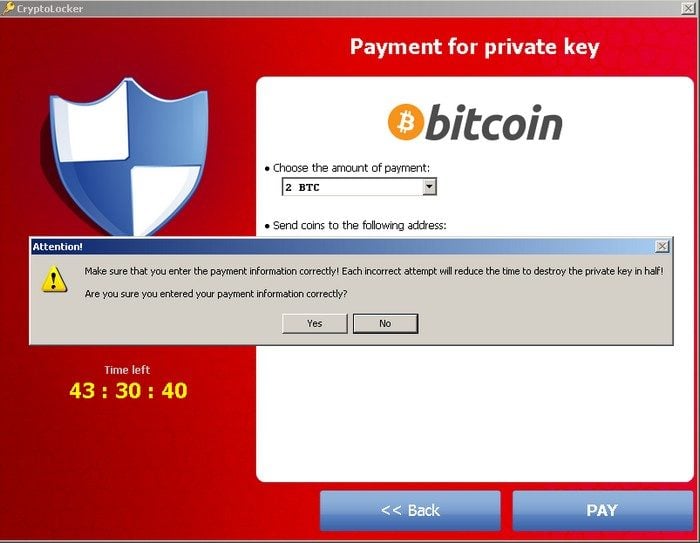 Un message apparaît ensuite, demandant à l’utilisateur de transférer une certaine somme en bitcoin dans un temps déterminé. Les exemples ci-dessous, les cybercriminels ont demandé le transfert de 2 bitcoins, soit l’équivalent – à l’époque – de 300 dollars.