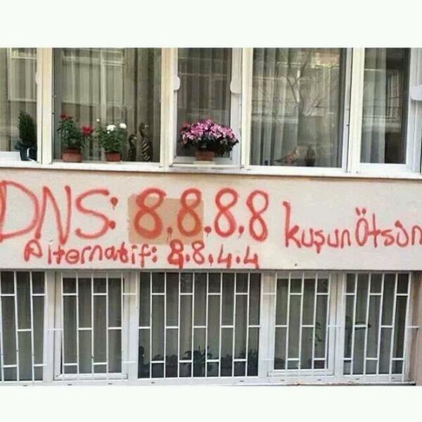 Le blocage du service DNS de Google n’est pas une surprise. Ce service, librement accessible, permettait aux internautes de contourner les procédures de blocages mis en place précédemment, par un assez simple paramétrage technique. D’ailleurs, certains internautes turcs n’hésitaient pas à taguer les adresses IP des serveurs DNS de Google sur les murs pour diffuser l’information. Selon Renesys, les serveurs DNS de Level 3 ont également été bloqués selon la même méthode.