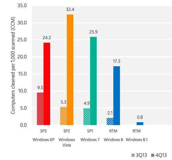 En page 65 de son rapport -qui en compte 152- on trouve ainsi un graphique qui permet de visualiser le nombre de PC infectés « nettoyés » pour 1000 ordinateurs scannés. Il en ressort que Windows Vista SP2 et Windows 7 SP1 sont davantage pris pour cible que Windows XP, avec respectivement 3,24%, 2,59% et 2,42% de PC infectés nettoyés. Et si Windows 8 est moins concerné, avec seulement 1,73%, il affiche en revanche la plus forte croissance en termes de machines corrompues, avec un ratio de 8,24 entre le troisième trimestre et le quatrième trimestre 2013. Le nouvel OS de Microsoft est suivi, pour ce qui est de la croissance du parc de machines infectées puis nettoyées, par Windows Vista SP2 (x 6,11), Windows 7 SP1 (x 5,28) et enfin Windows XP qui connaît une accélération de 2,55.
