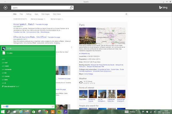 En bas, la vue « All Apps » montre, comme son nom l’indique, toutes les programmes installés sur le PC. Un champ de recherche universel –qui était déjà présent sur Windows 8- fait aussi son apparition dans le menu : il permet d’aller fouiller dans tous les programmes et documents de la machine, ainsi que sur le Web. Il se montre toutefois toujours perfectible : la recherche dans le contenu de documents ne fonctionne pas, tandis que la recherche sur le Web repose exclusivement sur Bing et ne contextualise pas les résultats, ce qui le rend assez peu utile… D’autant qu’il est évidemment impossible de changer de moteur !