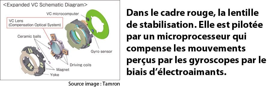 Efficace car adaptée à chaque optique, la stabilisation optique ne compense généralement les mouvements que sur deux axes et doit être absolument désactivée lors d’un usage sur trépied afin de stopper la lentille flottante. En continuant de fonctionner alors même que le trepied offre une parfaite stabilité, cette lentille flottante peut en effet générer des corrections qui n’ont plus lieu d’être.