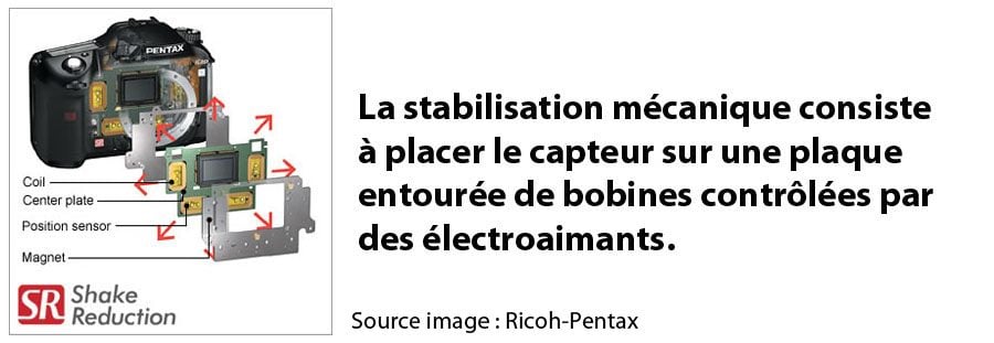 Ici, ce n’est pas une lentille flottante mais le capteur lui-même qui bouge et qui compense les mouvements parasites causés par le photographe. Dans les compacts, elle offre de meilleurs résultats que la stabilisation électronique, mais inférieurs à la stabilisation optique.