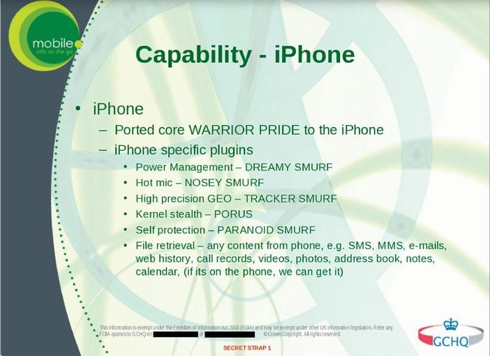 Le document remis par Edward Snowden contient dix diapositives, chacune montrant différentes tentatives d’affaiblir ou mettre à terre les mesures de sécurité des appareils produits par Apple – soit par un accès physique, soit à distance. Certains de ces slides laissent d’ailleurs craindre que la CIA a réussi à développer des plugins pour l’iPhone qui lui permettent de contourner les mesures de sécurité. « Si c’est sur le téléphone, nous pouvons y accéder », lit-on en bas d’une de ces diapositives. Cette dernière porte également le logo des services secrets britanniques et la mention du programme Warrior Pride, révélé l’année dernière. L’objectif de la CIA aurait été de porter sur iOS les fonctionnalités de ce programme d’espionnage, capable d’allumer le micro de l’appareil à distance, de suivre l’appareil avec une grande précision ou encore d’explorer et dérober toutes les informations présentes.