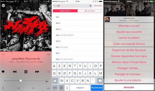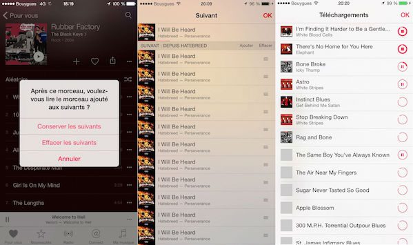 La gestion des chansons disponibles hors connexion est également étrange : on ne sait jamais vraiment si un morceau est disponible hors ligne ou non, à moins d’activer une option bien cachée dans la bibliothèque. Apple Music n’hésite d’ailleurs pas à télécharger en masse les fichiers y compris lorsque vous êtes connecté sur le réseau cellulaire… Et il n’y a apparemment aucun moyen de désactiver cette fonction. Gare à votre forfait ! Il est également difficile de retrouver l’écran « Suivant » qui permet de gérer les morceaux qui seront diffusés après celui que l’on est en train d’entendre.
