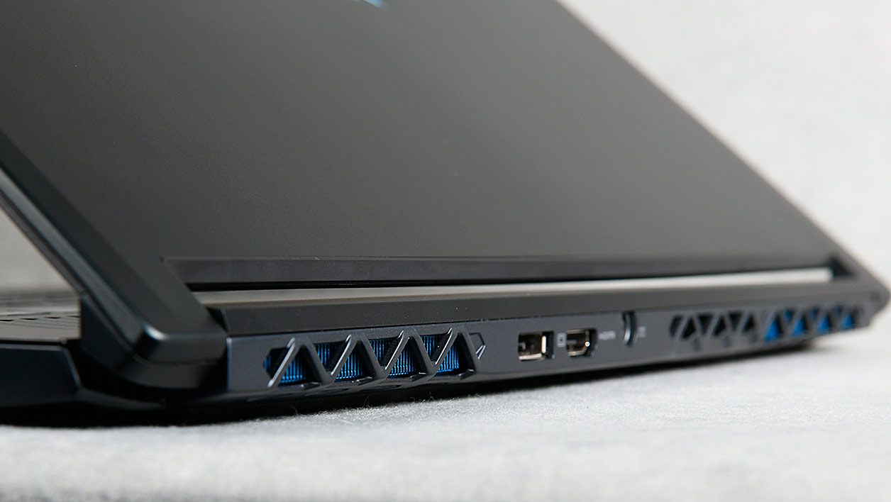 Sous le clavier tout rétroéclairé de bleu se cache une configuration vraiment musclée et assez semblable à celle du Zephyrus d’Asus, à savoir un processeur Intel Core i7-7700HQ, les 32 Go de mémoire, les deux SSD de 512 Go montés en RAID 0 et, bien entendu, la GeForce GTX 1080 Max-Q Design.