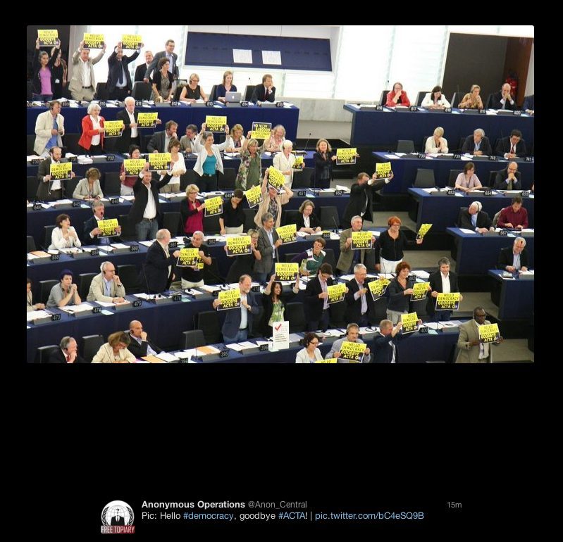 De même, les Anonymous, très impliqués dans la lutte, ont immédiatement posté une photo sur Twitter. On y voit des parlementaires brandir une pancarte « Hello Democracy, Goodbye ACTA. ». Un bon clap de fin pour ce film sombre.