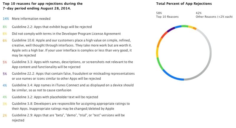 Quoi qu’il en soit, à en croire Apple, les dix raisons les plus courantes représentent « seulement » 58% du total des refus. Les causes de rejet constituant les 42% restants ne représentent pas plus de 2% chacune mais laissent encore un peu de place à l’opacité…