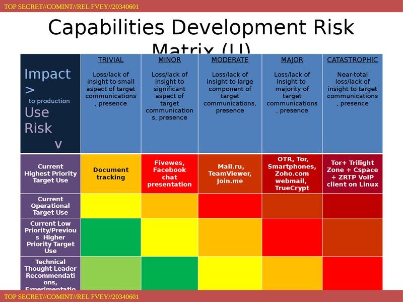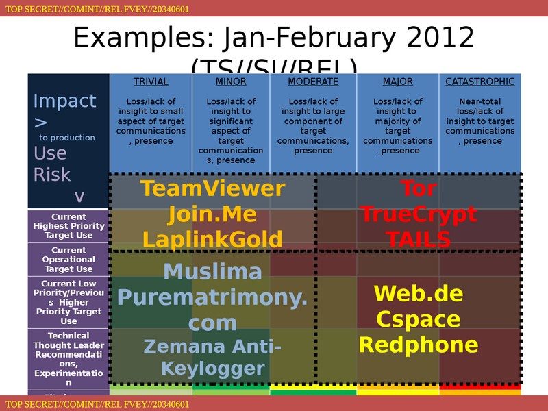 En effet, selon un document datant de 2012, la NSA procède elle-même à un classement des technologies de chiffrement, allant de « trivial » à « catastrophique ». Suivre le chemin que prend un document lorsqu’il est envoyé à travers la Toile est ainsi « trivial ». Lire les chats sur Facebook est d’une difficulté « mineure ». Eplucher les emails de mail.ru ou intercepter des échanges de logiciels professionnels tels que Teamviewer (prise contrôle à distance) ou Join.me (conférences audio avec partage d’écran) est déjà plus dur.