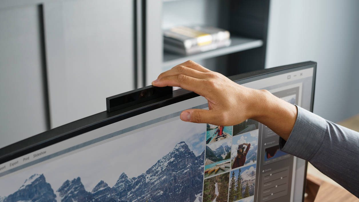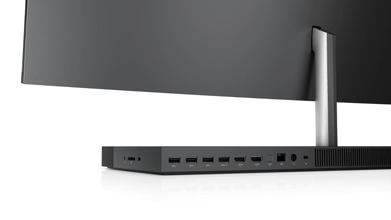 On retrouve donc l’écran légèrement courbé de 34 pouces, aux bords extrêmement fins et offrant une définition d’image de 3440 par 1440 pixels (ratio 21:9). Et s’il n’est pas possible d’ajuster la hauteur, il est toutefois possible de faire varier l’inclinaison jusqu’à 25° vers l’arrière pour plus de confort. A noter, en haut de l’écran se trouve la webcam, escamotable d’une pression, pour éviter de “défigurer” inutilement l’appareil.