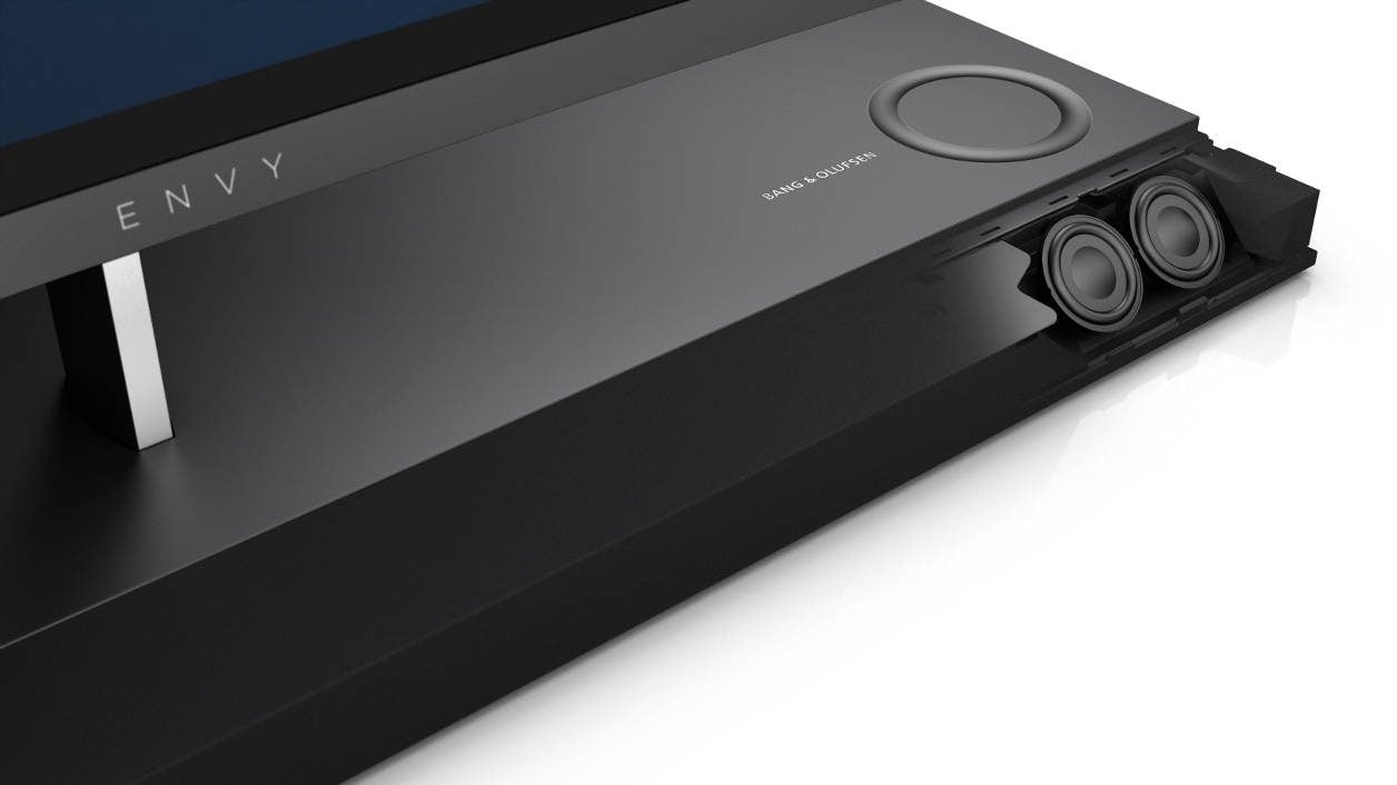 Dernier élément présent dans le socle, le kit stéréo de 2 x 2 enceintes épaulé par deux radiateurs passifs (pour le rendu des basses) estampillés Bang & Olufsen. Le tout est orienté à 45° vers l’utilisateur afin que ce dernier en profite pleinement lors du visionnage de vidéo ou de l’écoute de musique. Le réglage du volume peut se faire depuis Windows 10 ou, plus simplement, en faisant bouger le doigt dans la zone sensitive en forme de cercle, présente sur le dessus droit du pied.