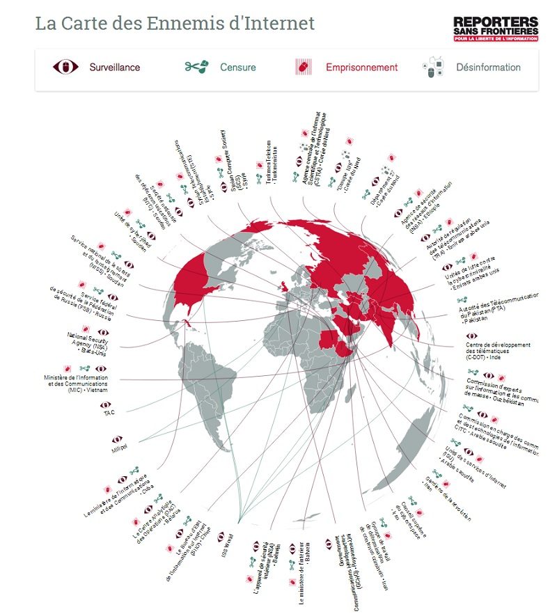 Tous les 12 mars, journée de lutte contre la cyber-censure, Reporters sans Frontières dénonce dans un classement les ennemis d’Internet. Après s’être concentrée sur les sociétés privées de surveillance en 2013, l’association revient à une formule plus classique avec une liste de pays. Elle ne prend toutefois pas pour cible des Etats mais certaines de leurs institutions qui « mettent en œuvre la répression en ligne et les atteintes technologiques à la liberté de l’information ».