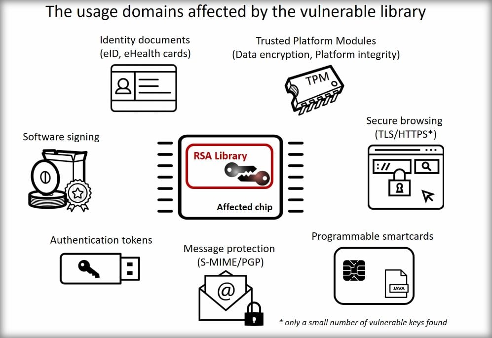 Quel est l’impact cette vulnérabilité ? Cela dépend du secteur d’application. En Estonie, elle aurait affecté plus de 750.000 cartes d’identité que l’état a délivrées aux citoyens et qui embarquaient un certificat RSA pour générer des signatures électroniques. Ces clés doivent maintenant toutes être remplacées. Certains modèles des tokens d’authentification de Yubikey sont également impactés.