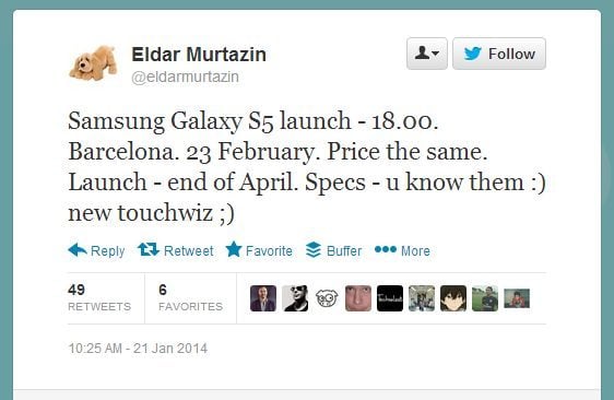 Une autre information a fuité sur Twitter ce 21 janvier. Le célèbre analyste russe Eldar Murtazin (celui qui avait annoncé la sortie du S4) estime que le Galaxy S5 sera révélé lors du Mobile World Congress de Barcelone le 23 février et qu’il sera en vente fin avril.