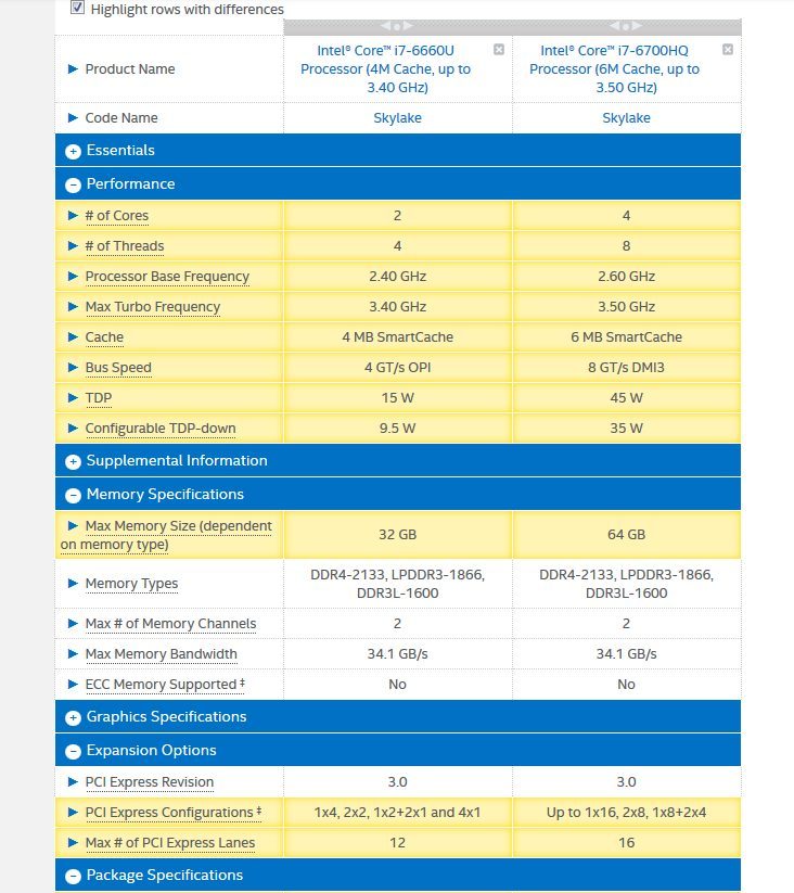 Ci-dessous, une rapide comparaison entre les spécificités techniques des processeurs Intel Skylake Core de 6ème génération, à gauche le haut de gamme basse consommation ; à droite, la puce la plus plébiscitée par les machines de jeux portables actuelles.