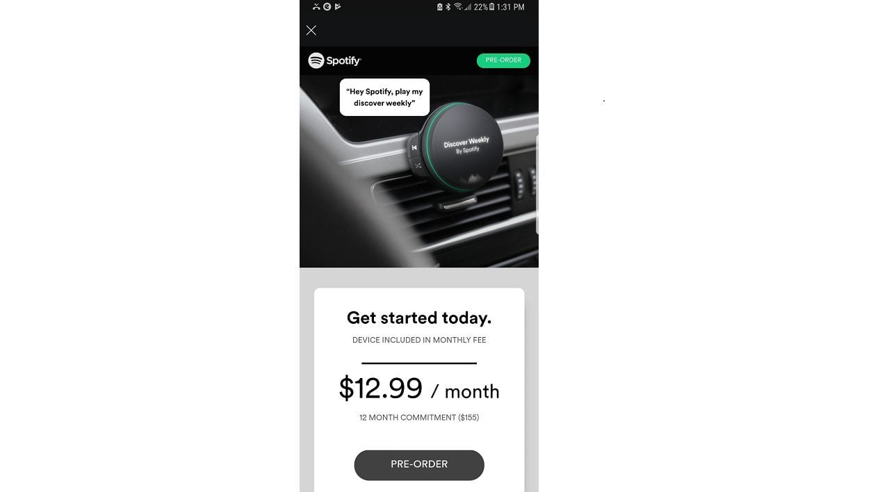 Plusieurs utilisateurs ont effectivement constaté qu’une publicité pour l’appareil s’était affichée, manifestement par erreur, au sein de l’application, comme le rapporte The Verge. Le visuel le montrait en compagnie d’une offre tarifée à 12,99 dollars avec un engagement de 12 mois comprenant a priori l’abonnement au service et la location de l’appareil. Le prix habituel d’un abonnement nu est de 9,99 dollars sans engagement.