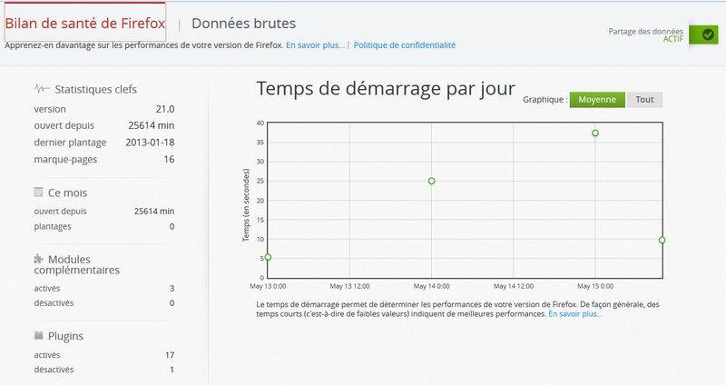 Autre nouveauté : le « Bilan de santé de Firefox » (Firefox Health Report). Cette fonctionnalité permet de collecter dans des logs tout un tas de données sur l’utilisation du navigateur : temps de démarrage, temps d’utilisation, nombre de crashes, etc. Pour y accéder, il faut aller dans le menu « Aide » de votre navigateur. Pour l’instant, les informations présentées sont assez sommaires, mais à terme cette fonctionnalité devrait permettre à l’internaute non seulement de comprendre les éventuels problèmes, mais aussi d’y remédier, un peu comme si l’on répare sa propre voiture.