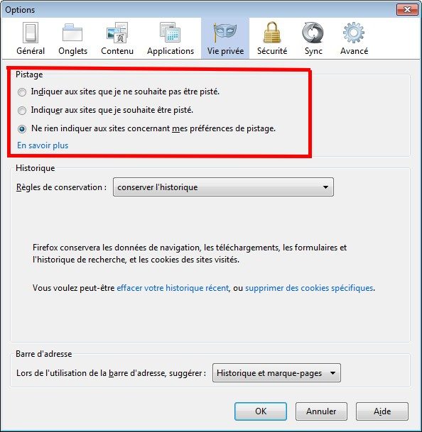 Enfin, Firefox 21 a amélioré la fonction « Do Not Track » qui, rappelons-le, permet à un internaute de ne pas se faire espionner par les agences de publicité. Dans le menu « Options », l’utilisateur pouvait choisir jusqu’à présent entre « indiquer aux sites que je ne souhaite pas être pisté » et « ne rien indiquer aux sites concernant mes préférences de pistage ». Désormais, une troisième option est offerte à ceux qui adorent les publicités : « indiquer aux sites que je souhaite être pisté ». Certains trouveront bizarre l’existence d’une telle option, mais selon Mozilla, il existe des personnes qui veulent manifester leur volonté d’être pisté dans le but « de voir des publicités de meilleure qualité ».