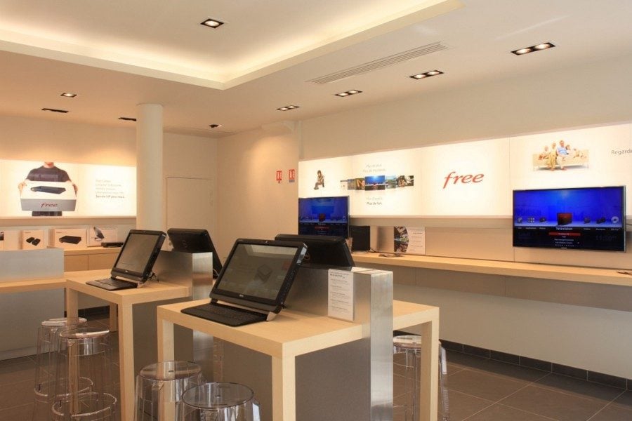 Les sites Univers Freebox et Freenews indiquent que Free a ouvert son premier magasin physique, dans le centre-ville de Rouen, au 31 rue Jeanne-d’Arc. Ce Free Center, au design épuré, vise à présenter l’offre de l’entreprise. Les visiteurs, qu’ils soient Freenautes ou pas, peuvent tester les fonctions de la Freebox Révolution, se faire conseiller sur des questions commerciales ou techniques.