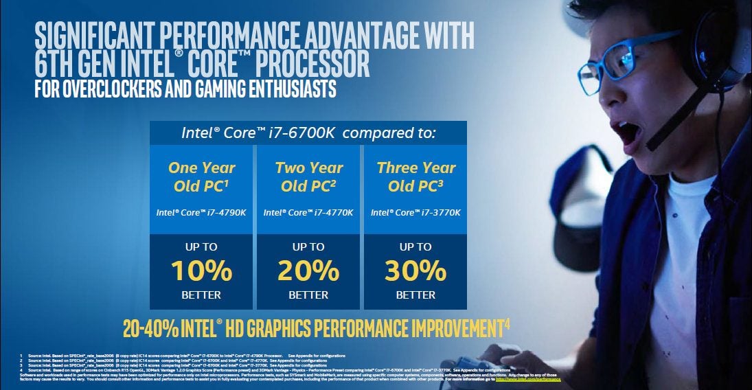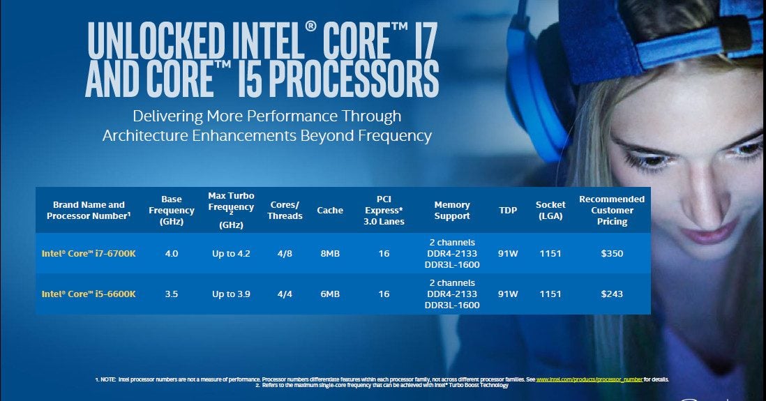 Pour rappel, il s’agit de la sixième génération de processeurs de la famille Core, la cinquième étant celle des Broadwell-U cantonnée aux PC portables. Tous ces processeurs sont ou seront gravés en 14 nm, ce qui devraient offrir un rapport performance/consommation supérieur aux actuels modèles pour PC de bureau, gravés en 22 nm.
