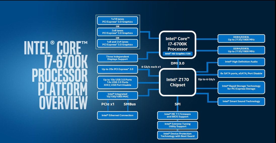 Parmi les autres changements, la partie graphique intégrée (Intel HD Graphics 530) serait cadencée à plus de 1 GHz et encaisserait les bidouilles des overclockers fous. Les fréquences des puces pourraient être augmentées manuellement, encore plus haut qu’avec n’importe quelle autre génération de Core. Pour cela, Intel a complètement déverrouillé certains composants techniques, tant au niveau de la puce que de la prise en charge et de la gestion de la mémoire, permettant de booster les composants par l’intermédiaire du tout nouveau chipset Intel présent sur la carte mère, le Z170.