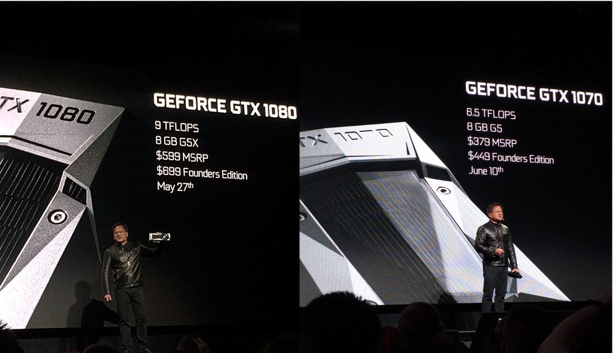 GeForce GTX 1080 et GTX 1070. C’est lors d’un événement regroupant la presse spécialisée à Austin, au Texas (l’un des fiefs d’AMD d’ailleurs) que NVIDIA a présenté ses poulains 3D dernier cri, dont le nom avait fuité depuis quelques semaines sur la Toile. « Ce GPU [celui de la GTX 1080] a coûté plusieurs milliards de dollars en recherche et développement et nous sommes très fiers du résultat » annonçait, tout sourire, Jen-Hsun Huang, CEO de NVIDIA.