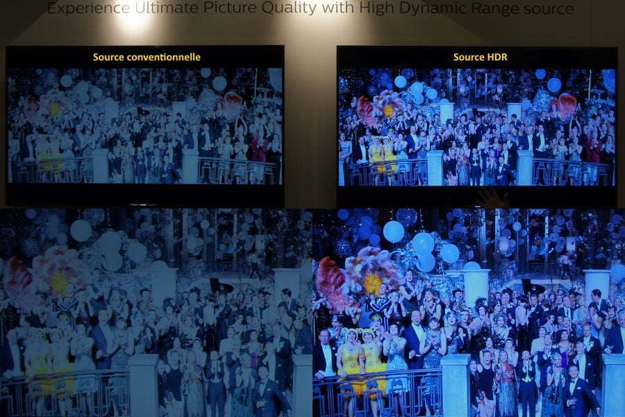 Sans trop le vouloir, Philips nous a prouvé que les téléviseurs dits « HDR » ne seront pas forcément indispensables pour profiter des améliorations visuelles d’une source HDR. Lors de la démonstration, deux téléviseurs classiques (non HDR) affichaient la version classique (à gauche) et la version HDR (à droite) d’un même film, The Great Gatsby.