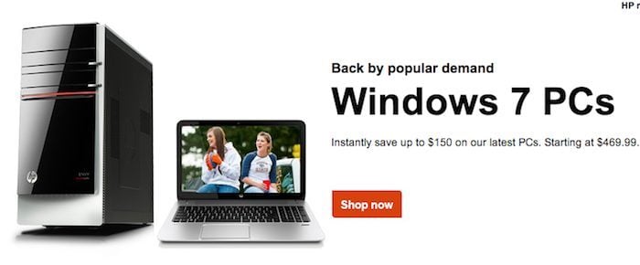 Encore une mauvaise nouvelle pour Microsoft et Windows 8. Depuis ce week-end, sur sa boutique en ligne américaine, HP fait en effet la promo de… Windows 7 ! L’ancien OS de Microsoft est annoncé « de retour à la demande générale » et largement mis en avant sur son magasin en ligne, aussi bien sur les les portables que les machines de bureau. Dans la section consacrée aux desktops, on a même du mal à trouver une config’ sous Windows 8.1, à vrai dire…