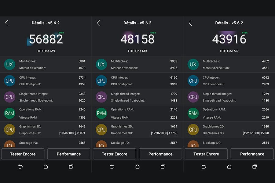 Nous avons évalué les performances du Snapdragon 810 avec l’outil Antutu. Avant la mise à jour déjà, les résultats n’étaient pas à la hauteur de nos attentes : autour de 56000 points au global avec 20000 points en score 3D. Une belle puissance sous le capot, supérieure à celle du M8, mais pas autant qu’on l’imaginait. Le Galaxy S6, par exemple, dépasse allègrement les 65000 points. Plus ennuyeux, après mise à jour, le score du M9 plafonne à 48000 points dont 17000 points en 3D, ce qui laisse supposer que le processeur ne tourne pas à pleine puissance, avec un avantage toutefois : il chauffe moins ! Après plusieurs minutes de tests et une température qui monte, les résultats chutent encore pour se stabiliser : moins de 44000 au global pour 15000 en score 3D. Pas simple de trouver le pourquoi du comment, mais il semblerait que HTC ait bridé le processeur de son smartphone pour éviter les coups de chaud. Nous reviendrons dans les prochainement sur les problèmes du Snapdragon 810 également constatés sur le G Flex 2.