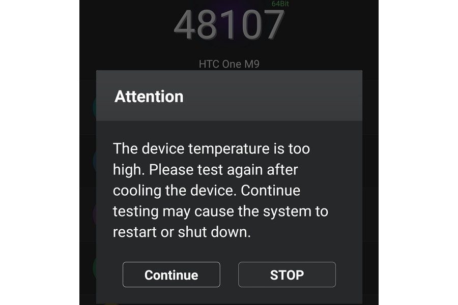 Fonctionnant avec Android Lollipop enrichi de la surcouche Sense 7, le HTC One M9 est équipé, à l’instar du LG G Flex 2, du processeur Qualcomm de dernière génération, Snapdragon 810. Avec ce processeur 64 bits à huit cœurs, composé de quatre cœurs A53 à 1,55 Ghz et de quatre cœurs A57 à 2 Ghz (le tout couplé à 3 Go de mémoire vive), le M9 était pressenti pour devenir l’un des smartphones les plus puissants de son temps. Dans la pratique, nous sommes un peu restés sur notre faim. La première version du mobile chauffait énormément, à tel point qu’au bout de seulement quelques minutes d’intense sollicitation (à l’occasion d’un second test avec l’outil Antutu notamment), un message d’avertissement apparaissait (voir ci-dessus). Rassurez-vous, HTC a réglé ce problème… mais pas suffisamment pour éviter quelques désagréments. La solution trouvée par le taïwanais est bien entendu de nature logicielle via une mise à jour. Après application de cette dernière, le mobile qui dépassait les 50°, n’outrepasse désormais plus les 41-42°. Nous l’avons vraiment poussé dans ses retranchements et n’avons pas constaté de nouveaux messages d’avertissement.