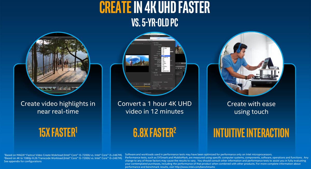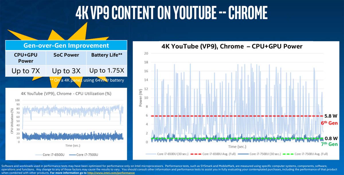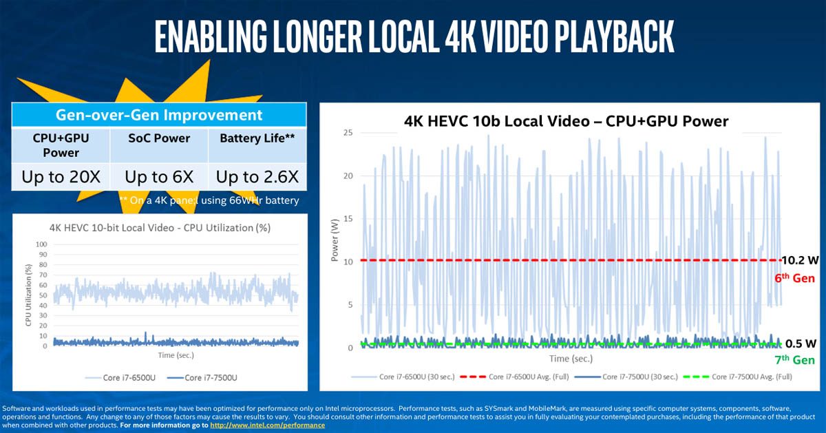 D’incomplète, la prise en charge de la vidéo 4K passe à quasi-totale pour cette nouvelle génération de Core. Ces processeurs prennent désormais en charge le décodage et l’encodage des vidéo 4K de manière matérielle – c’est-à-dire sans intervention des transistors « généralistes » et sans soutien de la part de la carte graphique. Kaby Lake décode ainsi tous les flux VP9 (utilisés par YouTube) et HEVC 10 bit (utilisés dans les futurs Blu-ray UHD). Mieux, il est aussi capable d’encoder matériellement une vidéo en VP9 et HEVC (mais limité à 8 bit pour ce dernier).