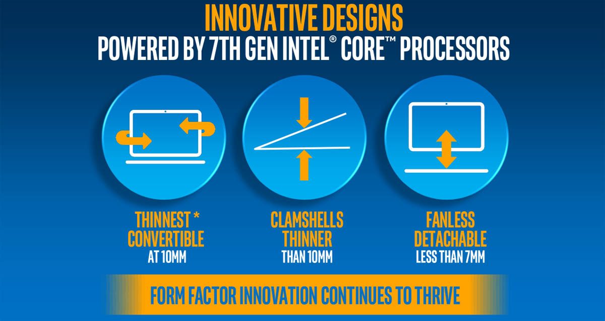 Ces formats les plus fins concernent bien évidemment les processeurs les moins énergivores et les plus sobres en dégagement de chaleur (TDP) : selon le modèle, cette 7e génération de Core dégage de 4,5W à 17W, et ce sont bien les premiers modèles qui devraient intégrer la majorité des PC au format tablette.