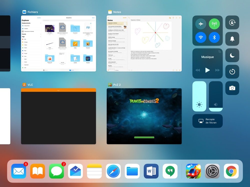 Depuis iOS 9, Apple propose de scinder l’écran entre deux applications sur les iPad. Avec iOS 11, il est désormais plus facile de passer d’un programme à un autre, notamment avec le nouveau Dock et la nouvelle interface qui regroupe appli ouverte et centre de contrôle.