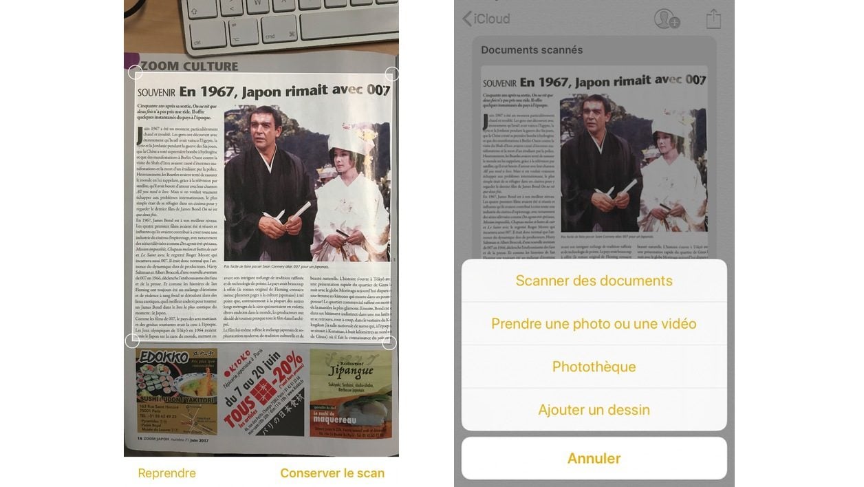 Tous ceux qui aiment bien garder trace d’un article lu sur un coin de table ou souhaitent conserver la trace d’une notice vont être ravis de savoir que Notes permet désormais de scanner un document, de recadrer sa numérisation, d’y ajouter des annotations, etc.