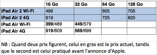 Pour ses tablettes, Apple a désormais décidé de conserver deux modèles 9,7 pouces, l’iPad Air sorti en 2013 et l’iPad Air 2, tout juste annoncé. Les autres générations d’iPad de cette taille ne sont plus vendues pas Apple.
