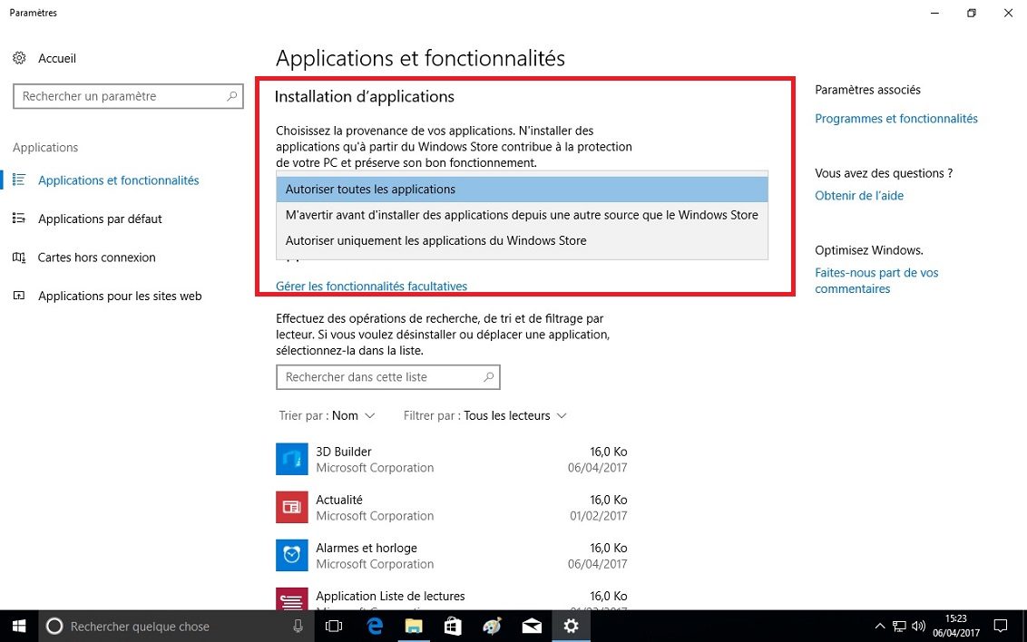 Si vous avez peur d’installer des applications suspectes, pouvant présenter un risque de sécurité, une fonction permet de n’autoriser que les programmes en provenance du Windows Store, voire d’alerter l’utilisateur si le programme que l’on désire installer est disponible dans le magasin logiciel de Microsoft.